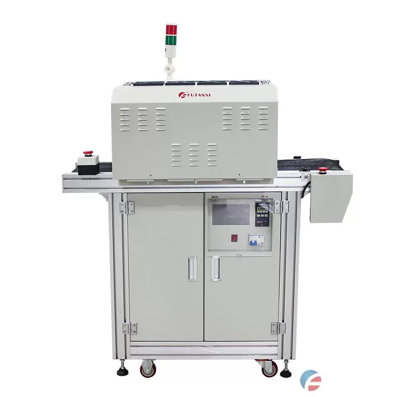 复坦希电子科技生产研发的UVLED三面照流水线烘箱,采用进口LED灯珠,具有能量高、光照均匀、光源稳定等优势,可根据使用需求选择UVLED面光源照射头数量(1-4个)。UVLED固化机采用触摸屏控制方式,功率可调(10%-100%),可自由设定照射时间。设备体积小,占地面积少,安装方便,可配合流水线车间配套使用。